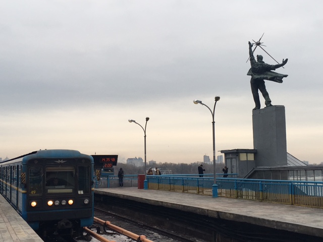 そして隣の「ドニプロ」駅に到着。「貴重」になるかもしれない、キエフ・メトロとソ連っぽいモニュメントです。