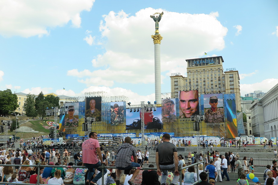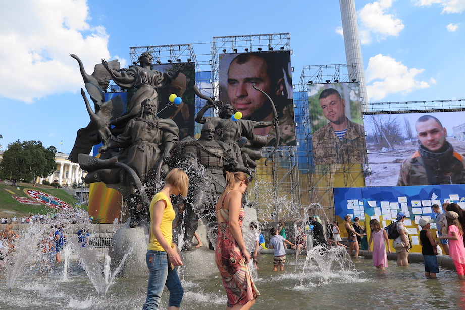 午後のマイダン。東部での戦闘で亡くなった方々の顔が写されています。