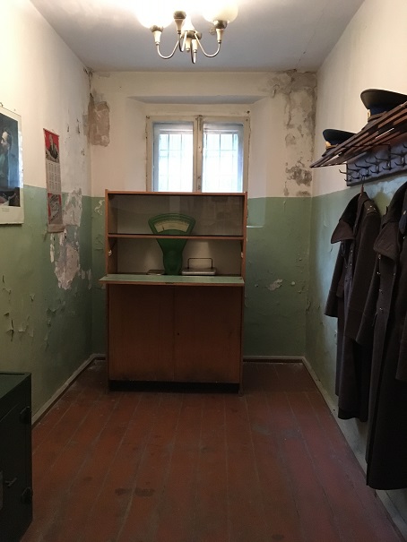 うっ!早々に独房(↓写真左)。懲罰用でしょうか。試しに入って扉を閉めているおじさんがいました、勇気あるなあ。私は無理です。それから、警備員の部屋にはKGBのコートがかけてあります(↓写真右)。