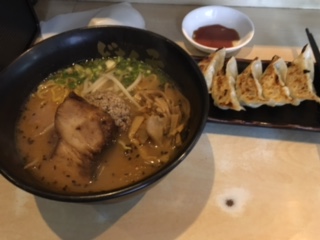 こちらはいわゆるスタンダードなラーメン。で、スープがめちゃおいしかったです。しかもシーズンサービスでセット餃子が7個に!