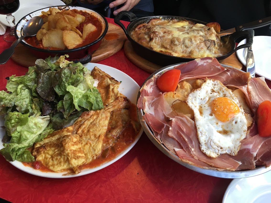 ここは旦那が研究者の友人に連れて来てもらったお店の支店。本店はCorvisartにあり、いつも開店前から長蛇の列ができています(地元の日本語新聞でも特集されていますね)。ワイワイな雰囲気で、ボリュームたっぷりのバスク料理を堪能できる人気店。本店とは異なり、シャロン支店は予約可能で、お店も比較的広かったので、グループでわいわいするなら最高。名物のサラダとオムレツ、そして一番人気らしい子牛の肉とじゃがいものクリームソースを注文しました。