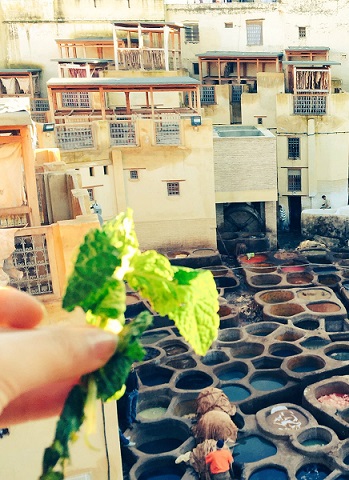 皮なめし場は、びっくりするくらいくさいです。なぜかっていうと、皮をやわらかくする為に、鳩の糞を使っているんですね。この糞を混ぜた液体がたまらなくくさい!!それゆえ、見学をする際には、ミントを手渡され、このミントを鼻の下にセットして、においを消しながら歩きます。(上の写真の右側の白い液体が、このくさい液体です。)
