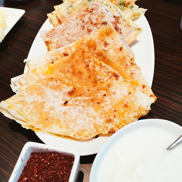 こちらはグタッブという折りたたんだクレープのようなお料理。中の具材は色々選べて、手前からカボチャ(ほのかな甘みが素晴らしい!私の一番のお気に入り)、ラムひき肉(男性陣が喜んでました)、ハーブ色々(ディルとパクチーと何か)の3種類を選びました。ちなみに、手前にある赤いパウダー、唐辛子かと思うじゃないですか?違うんです!味はゆかりふりかけに近い。酸味と塩気のあるパウダー。後々、色んな方に教えて頂いた結果、「スマック」という漆科の植物のパウダーだという事が判明。これがラムのグタッブとよく合うのですよ!