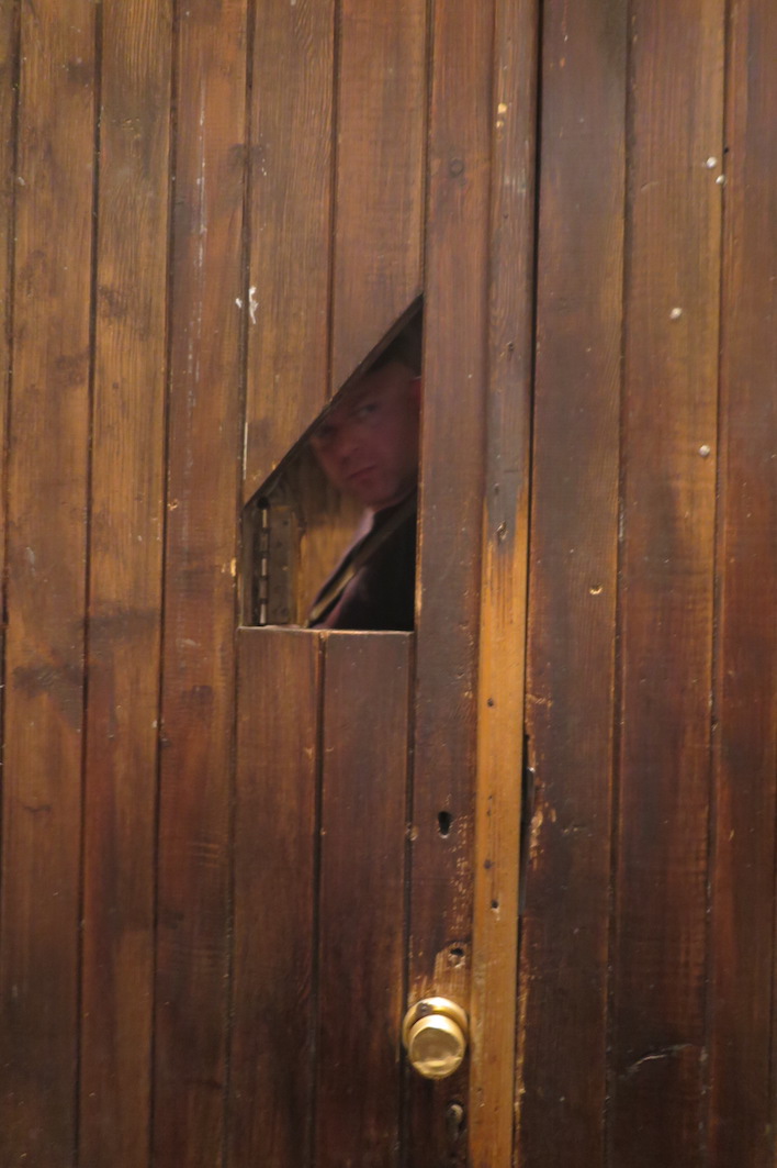 軍服を着たおじさんが小窓から顔をのぞかせています。