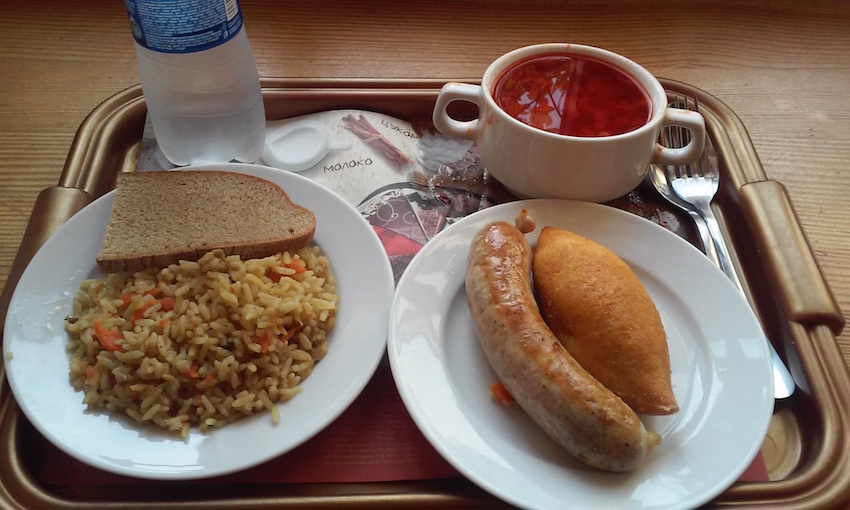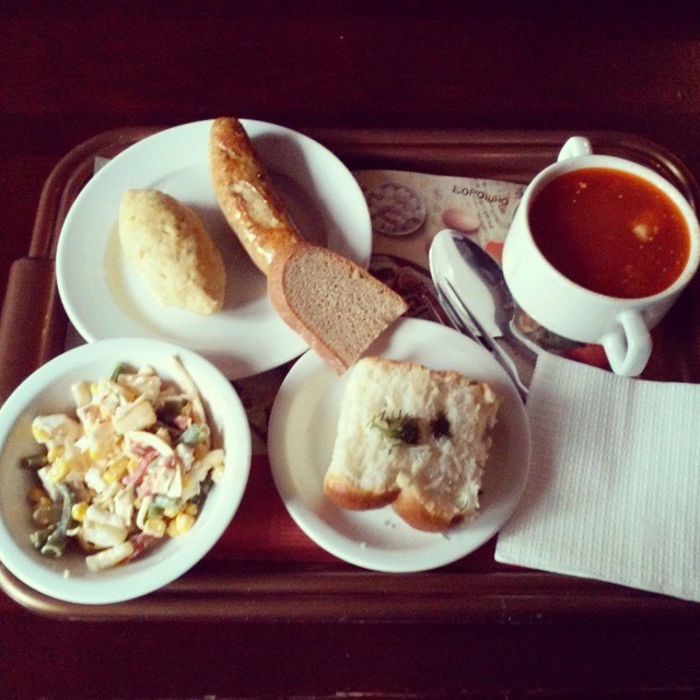 右上のスープが、あのボルシチです。今ウクライナ人は、世界中の人がロシア料理だと思っているこの料理の本家がウクライナだということを誇りに思っているようです。もう一つの「正統性」をめぐる争いですね。そしてパンの上にのっているのが、こっちではよくみかけるディル(奥様がアカンもの)。で、チキン・キエフ(キエフ風カツレツ)とソーセージ。サラダはドレッシング、マヨたっぷりなのでイケてません。