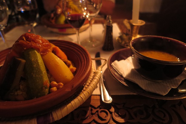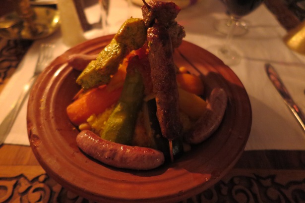 二人で乾杯をして、魚介たっぷりの前菜と、ベタなクスクス&タジンを頂きます。