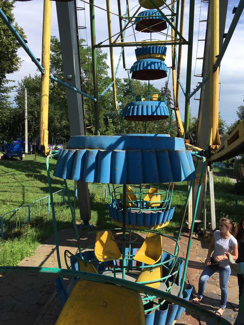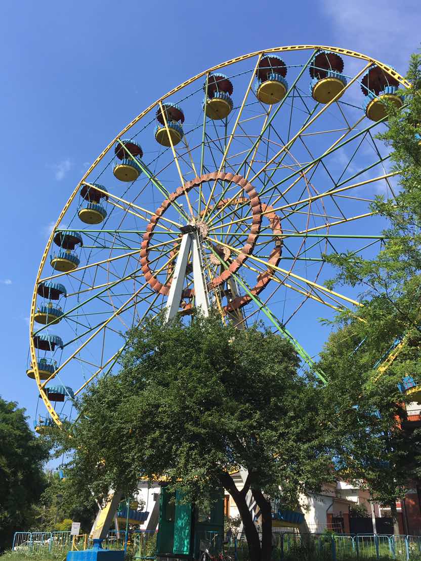 そう、私は高所恐怖症。でもソ連時代に出来たと思われる観覧車にどうしても「経験」として乗ってみたかったのです。奥様渋々承諾。一人、10UAH(40円ほど)の激安。この安さでいかにメンテナンスをしているのか、その点は不安だ。