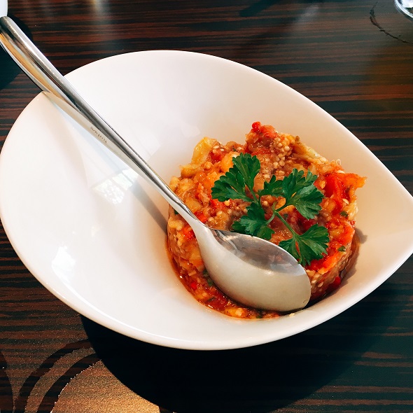 サラダから。こちらはトルコにもありますね、なすとパプリカとトマトのサラダ。