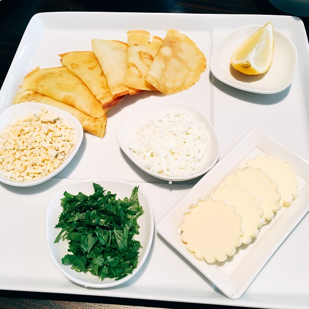 こちらはグタッブという折りたたんだクレープのようなお料理。中の具材は色々選べて、手前からカボチャ(ほのかな甘みが素晴らしい!私の一番のお気に入り)、ラムひき肉(男性陣が喜んでました)、ハーブ色々(ディルとパクチーと何か)の3種類を選びました。ちなみに、手前にある赤いパウダー、唐辛子かと思うじゃないですか?違うんです!味はゆかりふりかけに近い。酸味と塩気のあるパウダー。後々、色んな方に教えて頂いた結果、「スマック」という漆科の植物のパウダーだという事が判明。これがラムのグタッブとよく合うのですよ!
