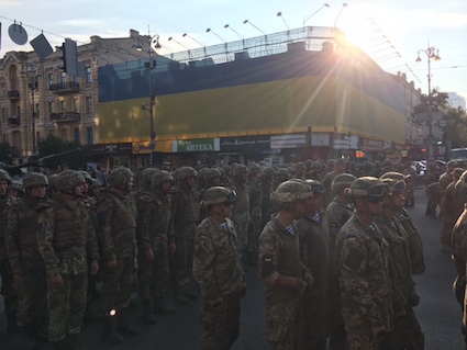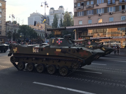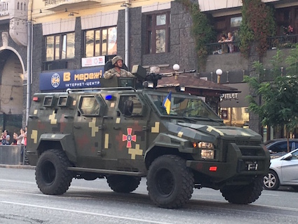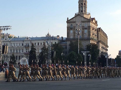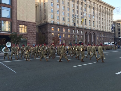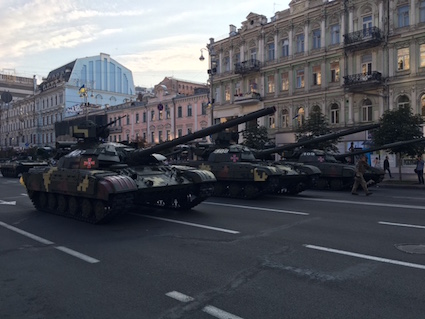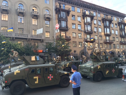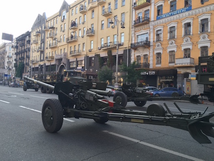 さて、独立記念日には目抜き通りであるフレチャ―チク通りで軍事パレードがあります。昨年はキエフにいましたが、わたしだけ別件がありパレードはちらりとしか見ることができませんでした。当日はかなりの人出で、特に大統領が登場するマイダン広場前はやって意味があるのかわからないセキュリティ・チェックがあります。昨年奥様は、フレチャ―チク通りのレストランの二階に場所を取りパレードの様子をみたようです。こちら「灯台下暗し」状態で、ほとんど人がおらず、上からゆったりと眺めたようです。