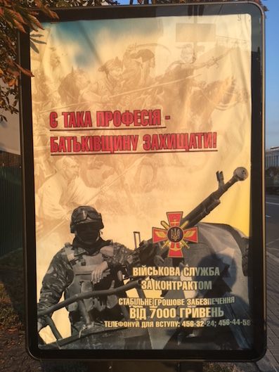 普段キエフはあまりにも平和でつい忘れてしまうのですが、現在ウクライナは戦争状態。東部ではいまだに戦闘が散発しここ数ヶ月でかなりの人が亡くなっています。街なかには軍のリクルートに関する宣伝も、賃金が安いですね涙。はやくこの国に平和がくることを祈っております。