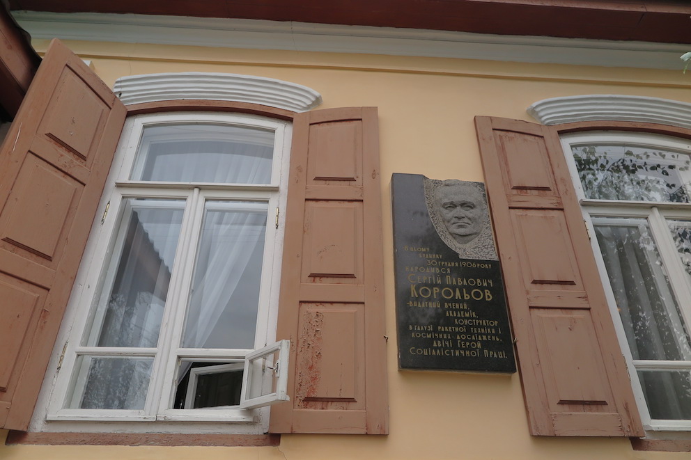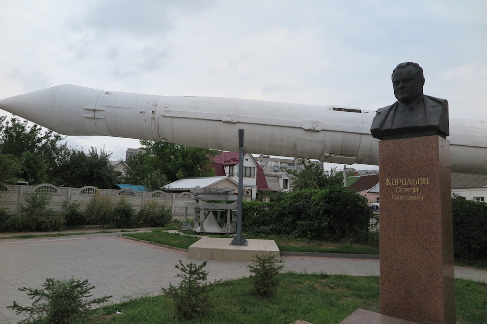 そう、あのコロリョフです。米ソ宇宙開発競争真っ只中で、ソ連の宇宙開発を主導したコロリョフ。R-7を開発し、西側に「スプートニク・ショック」を与えた彼の出身地が、なんとジトーミルだったのです!博物館の前にはコロリョフの胸像とR-5ミサイル!