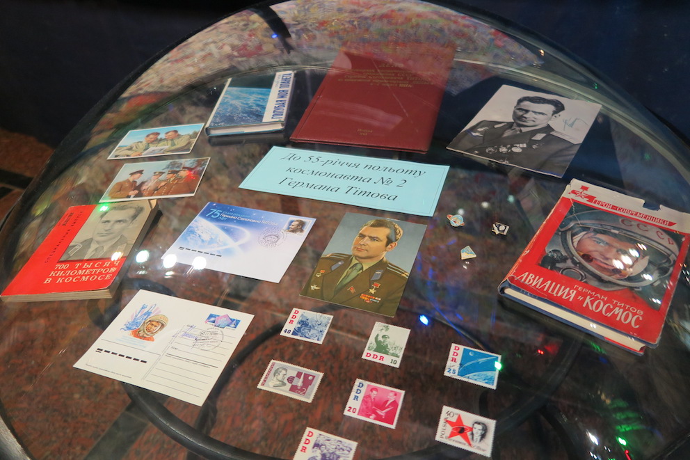 そして、この日は偶然にも、ガガーリンの次に宇宙に行ったソ連飛行士ゲルマン・チトフを載せた「ボストーク2号」が打ちあがって55周年に当たる日でした。そのためかわかりませんが、小さな博物館なのに子供連れでいっぱいでした。下の写真は、チトフについての諸々。ただし特にイベントなどは行われていません。田舎の郷土資料館のような、ほのぼのとした空気が流れています。