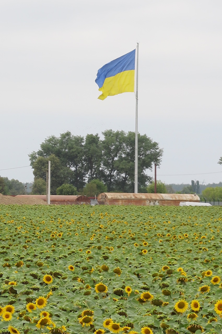 ですが、もう夏の終わりでしょうか、ヒマワリに元気がありません。悲しい色になっています。それでもなんとか局地的に咲き誇っているところをウクライナ国旗とともにパチリ。