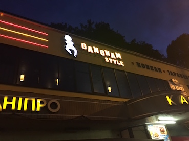 恐らく許可とかはとっていないでしょうが、お店のマスコットキャラクターもPSYっぽいです。キエフだからバレないと考えているのでしょう(笑)