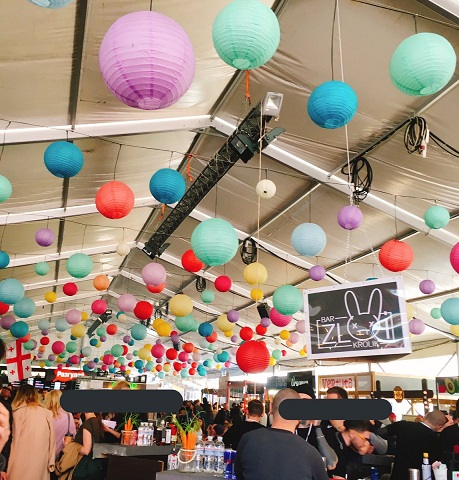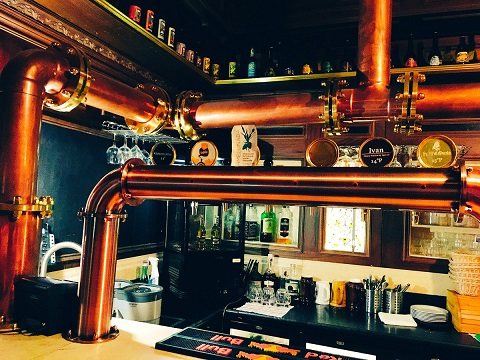 店内で醸造されたビール樽とサーバーを繋ぐ巨大なパイプが店内を横断しています。