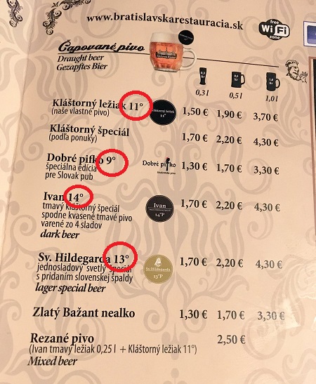 チェコとスロバキアのビールに記載されている数字は、「バリング度」という、発酵前の麦汁の糖度を表す数値だとわかりました。このバリング度が高ければ高いほど、味が濃くなり、アルコール度数も高くなるようです。