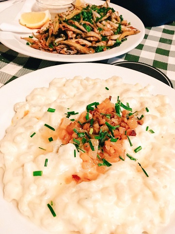お酒のお供はこちら。スロバキア料理の代表格、「ブリンゾベー・ハルシュキ」、ヤギチーズのニョッキです。なかなかの獣臭、そしてカロリーですが、美味しいです。黒胡椒たっぷりかけると美味しいです。