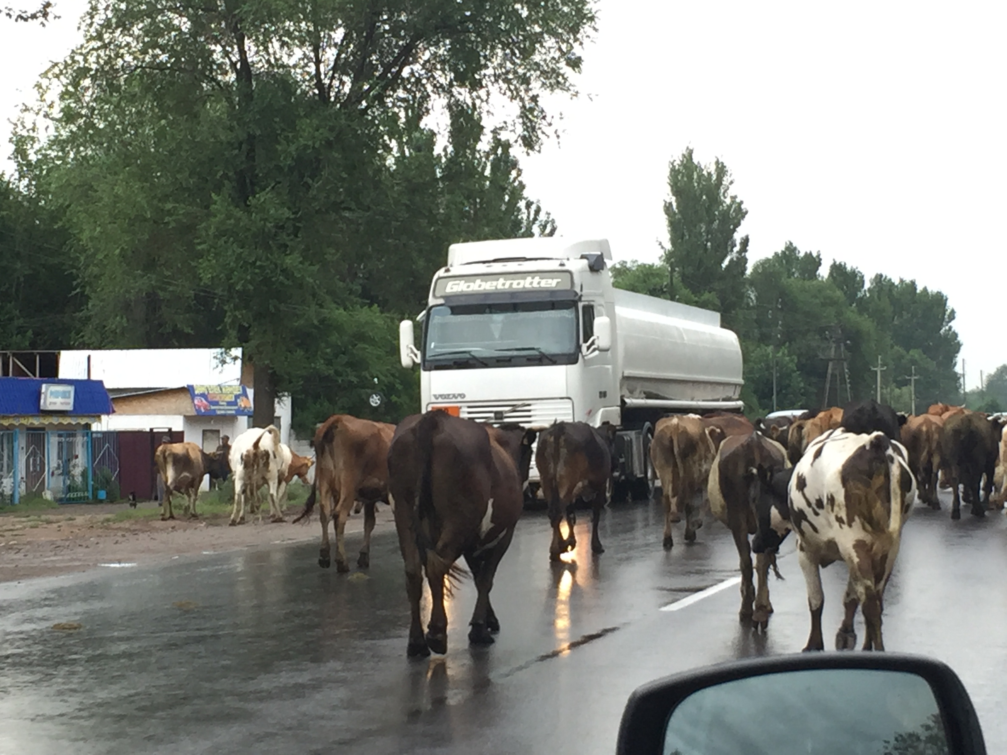 さて、空港を出て、アルマティをスキップし、向かうはアルマティよりもさらに東、中国方面です。早朝ですので車は少ないですが、牛や馬の行列が!ここで妻に事件は起こったのです笑。