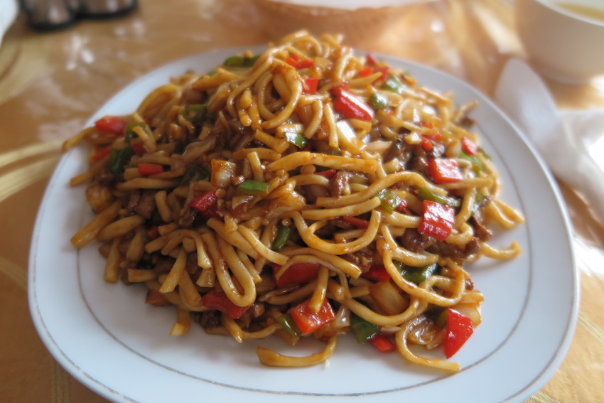 そしてチャリン・キャニオンから異なる方面に向かうMr.カレルをおろし、さらに中国国境方面に向けて車を走らせます。チュンジャという街を通過し、途中偶然発見した田舎のレストランで、本場のラグマンをいただきました。ラグマンはラーメンの語源とも。でもキエフで食べているラグマンとは違ってスープのなかに麺があるタイプではなく、焼きうどんや焼きそばのようなものがでてきました。なんでもいろいろな種類が多いそうです!
