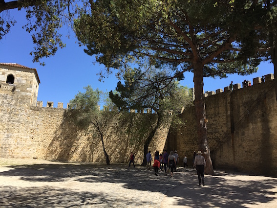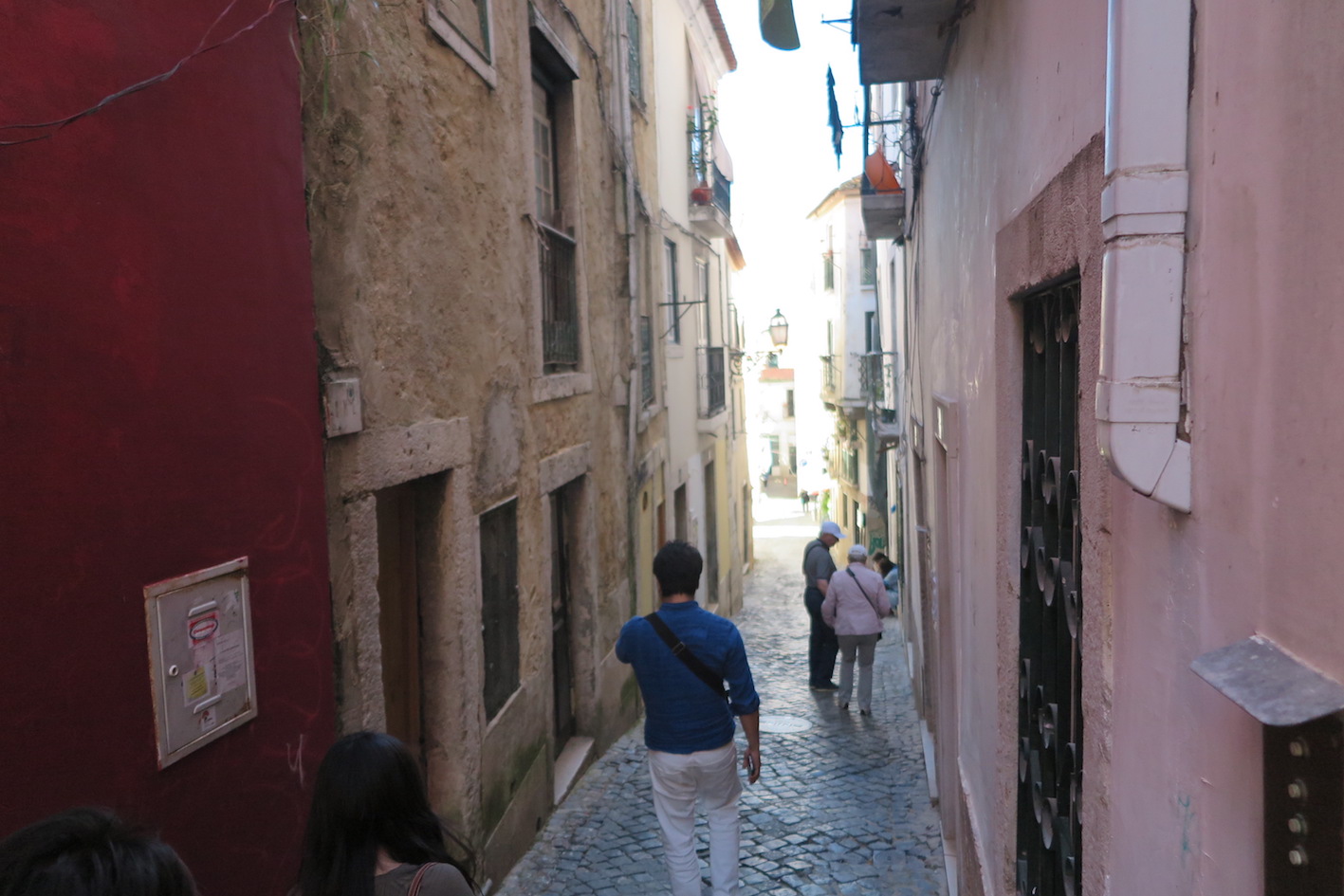 そしてリスボン大聖堂経由でサンジョルジェ城を目指します。この街は坂道が多いことで知られていますが、狭い道でもトラムが自由に走ります。