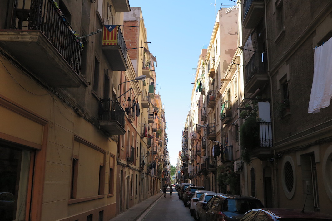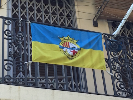お、一瞬ウクライナカラーと思いきや、違います!バルセロナはカタルーニャ語も公用語で、かつてフランコ政権下では抑圧されていた歴史をもっていますから、強烈な地域アイデンティティがあります。カタルーニャの旗を掲げるアパートがなんと多いことか。そして下の旗は、海沿いのバルセロネータ地区のものということです。
