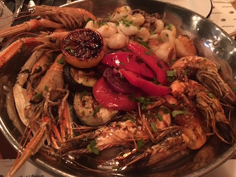 そして海鮮盛り合わせ(小)です。エビ、イカ、ホタテ、野菜など。三種類のソースとともに。