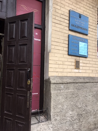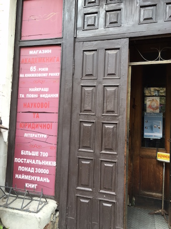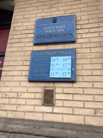 で、今回発見したボグダン・フメルニツキ―通りの本屋。店の前にはプレートがあります。国家・公共機関(例えばビザ発給事務所)だとこういうプレートがあるので、ここも何か指定を受けているのでしょう。「アカデミア・クニーガ(アカデミック本屋?)」なんて書いています。面白そう。