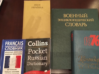 ずっと欲しいと思っていた、定番Collinsの英ロ辞典。これで英ロ共通単語を探しだして、先に覚えていきたいと思います。あとは、奥様がお母さまのために購入した仏・ウ辞典。そして自分のために、ウクライナ女流詩人レシア・ウクラインカの詩集を買っていました。おばさんが積み上げられた本の中から探しだしてくれたようです!