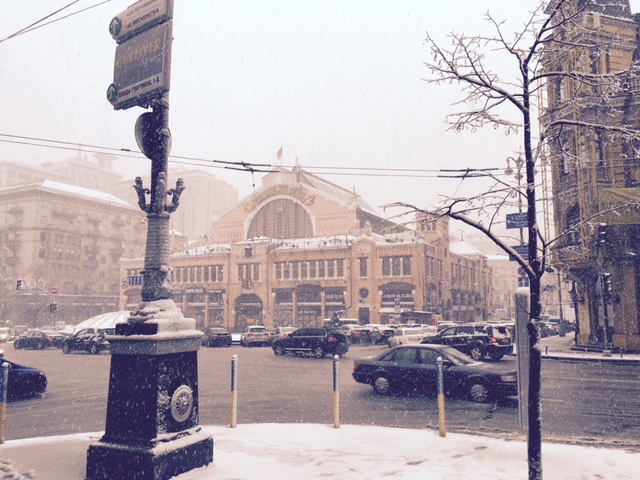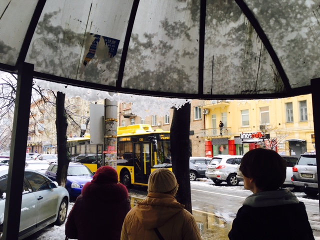 バス停、おばちゃん、頭危ない!キエフは道がガタガタなところが多いので(特にバス停前)、雪が降り始めたころはシャーベット状の水たまりで足元がグチョグチョになりました。