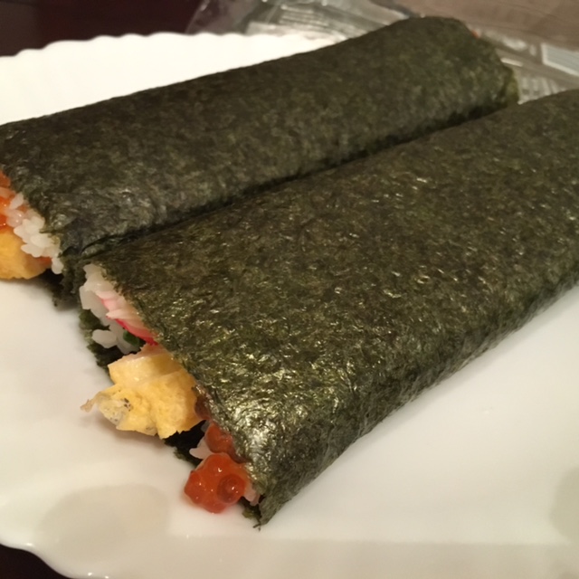 テンションあがって、関西人ということもあり節分用になんちゃって恵方巻き作っちゃいました。酢飯をうまい具合に作るのって結構難しいんですね。知らなかった。こちらでは、とびっこも売っていますが、近くのスーパーにはなかったので、贅沢にもいくらを使いました。あとはカニカマも普通に売っています。ちゃんと南南東向いて食べたで!