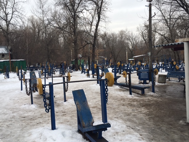もう少し進むと、夏は人で溢れかえっていた「ジム」。夏ほどではありませんが、ちらほら若い人やおじさんたちが体を鍛えに雪の中わざわざやってきてました。おじさん、ものすごい体。ソ連時代からあり、鉄などの廃材で作った器具です。平日昼だったので少なかったのかもしれません、もしやすると、冬も関係なく夕方からは混んでいるかもしれないです。寒い中、お金もあまりないし、やることもないので、体を鍛えようということでしょうか...