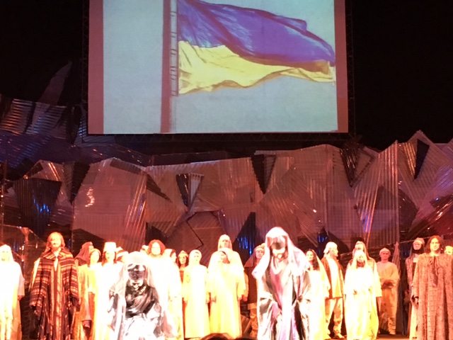 詳細は書きませんが、演出がすごく斬新。モダンなオペラなんでしょう。いろいろ調べてみると、モーゼの物語をウクライナの歴史に重ねて描いたもののようです。ですから、オペラのプロローグとエピローグにはスクリーンが上から降りてきて、ウクライナの歴史が映されます。