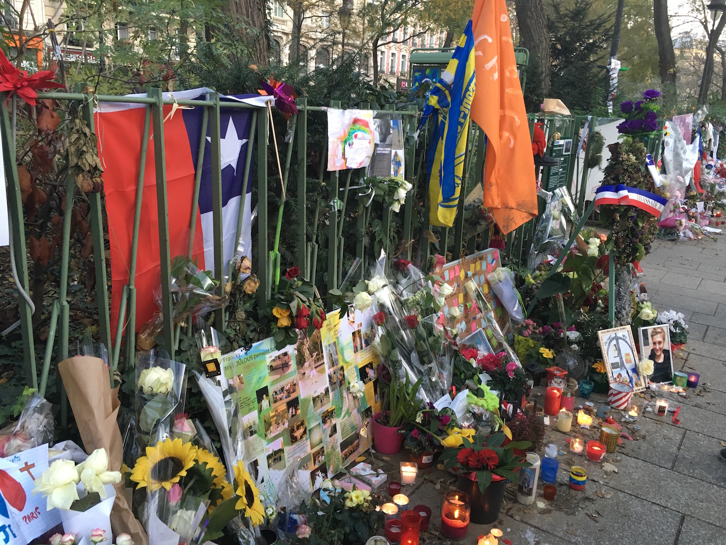 世界各国からの献花。パリはテロの影響で、このシーズンにしては観光客は少なかったと思いますが、ここに訪れ追悼している人はたくさん見ました。