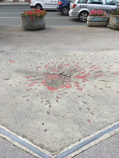 ここは市民が砲撃によって命を落とした場所で、えぐれたアスファルトに赤い樹脂を流し込んで固めたものです。その広がる赤いさまから、「サラエボのバラ」と呼ぶのだそうです。