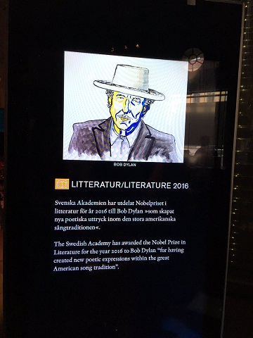 最近の受賞者の顔写真パネルが。しかしボブ・ディランだけ似顔絵笑。許可とれなかったのかなー。