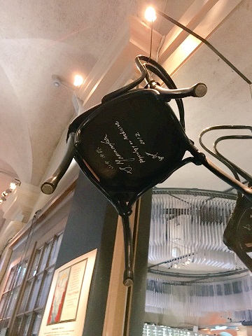 日本人受賞者のサインはないかなーと探したら、山中さんのサイン入り椅子が、なぜか吊られてました。日本人が聞きまくるからでしょうか・・・?ごめんなさい。
