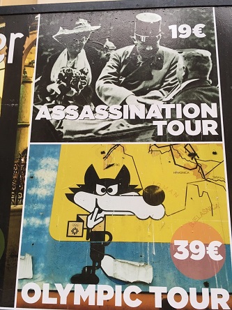 ↓は「暗殺ツアー」と書いてあります。他にも、大虐殺のあったスレブレニツァへのツアー、ユーゴスラヴィア紛争時に使われていた地下壕の見学ツアーなんかもありました。