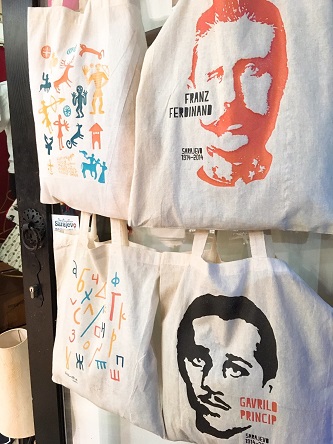 イカしたお土産も売ってました。トートバッグ各種:暗殺されたフランツ・フェルディナンド(右上)と、暗殺者のプリンチプ(右下)の似顔絵入り(夫に買いました)、後日訪問予定のステチュツィの石碑に描かれた絵の柄(左上)、ボスニアで使われているキリル文字(今まで訪れたキリル文字使用国では見たことないやつがいる!)の柄(左下)などなど。おしゃれですね。