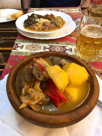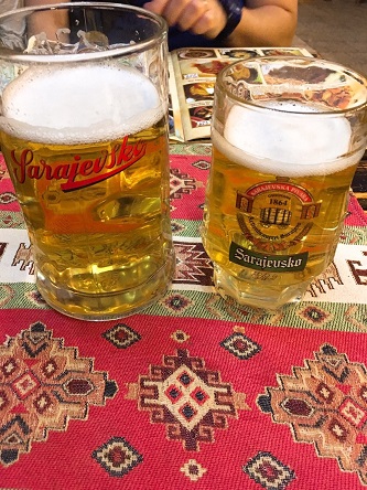 サラエボのビール、サライェブスカをいただきます。右の写真はあっさりとしたシチューのロナッチ。とても美味しかった。