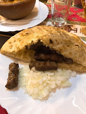 それから、左がボスニアのファストフードともいえる、チェバ・プチチ。釜焼きパンに釜でグリルしたひき肉串とみじん切りタマネギを入れただけのシンプル料理だけど、美味しい!!