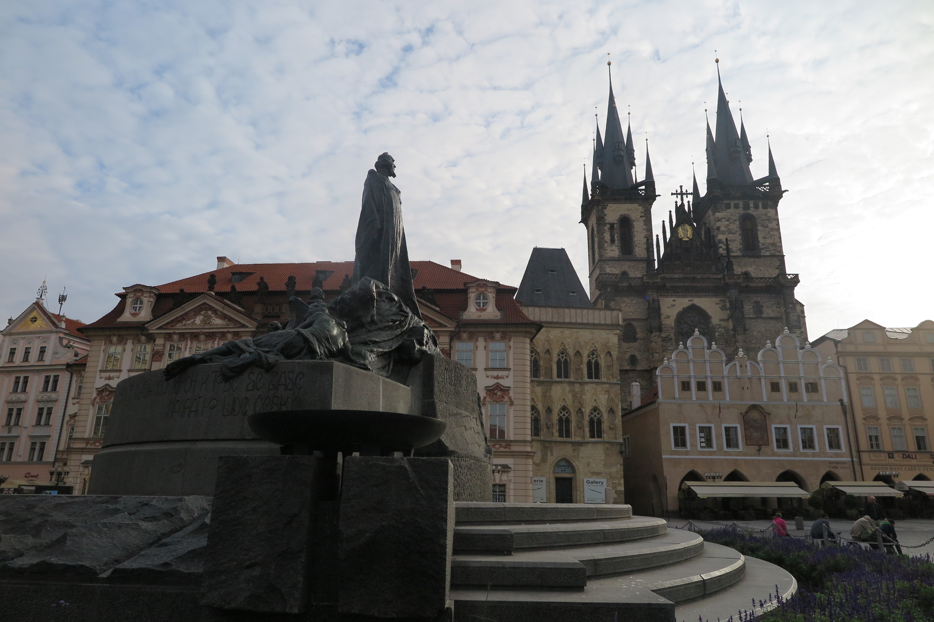 旧市街広場。世界史で学んだ、チェコの宗教改革者で最終的に火あぶりの刑に処されたヤン・フスの像。彼はチェコでは英雄扱い。そしてこの広場には、ティーン教会と聖ミクラーシュ教会があります。