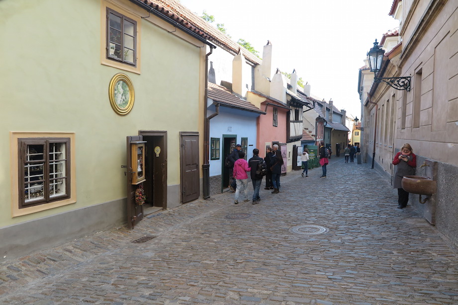黄金の小路。青の家が、かつてカフカが住んでいた家。前住んでいたところがうるさくて、ここに移って来たらしいよ。
