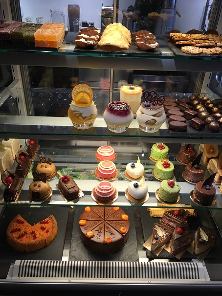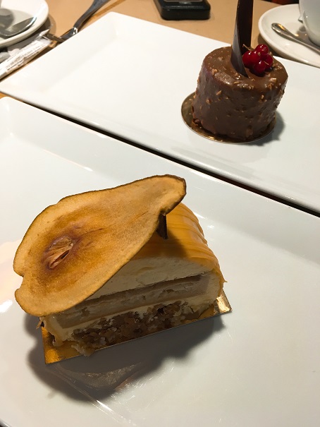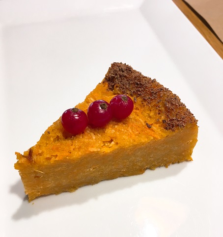 ケーキはこんな感じ。私は洋ナシとキャラメルのムース、友人夫妻はヨーグルトムースのチョコがけと、ヘルシーにんじんケーキ(グルテンフリー?)を注文。洋ナシムースはめちゃくちゃ美味しくて大満足です。にんじんケーキはサラダ食べてる感じなので、ダイエット中だけどどうしてもスイーツ食べたい人にお勧めかもしれません。