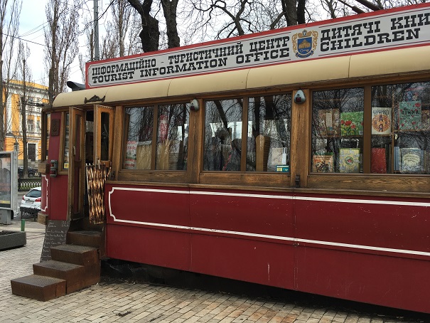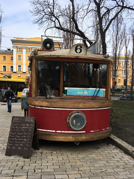 こちらはタラス・シェフチェンコ公園の中にある、トラムの車両を使ったカフェ。(写真のバックの黄色い建物はタラス・シェフチェンコ大学ですね。)