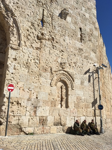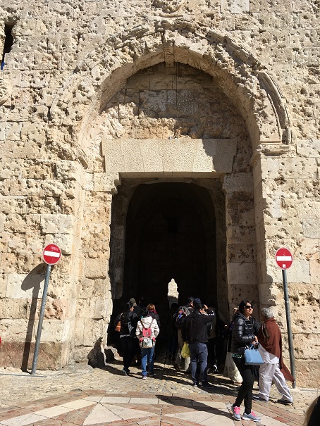 旧市街は4つの地区(アルメニア人地区、キリスト教徒地区、ユダヤ人地区、ムスリム地区)に分かれており、取り囲む城壁には、現在7つの門があります。我々はその内の、1540年に作られたという、「シオン門」から入ります。
